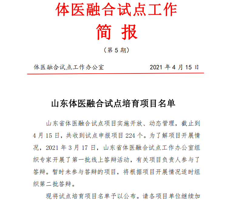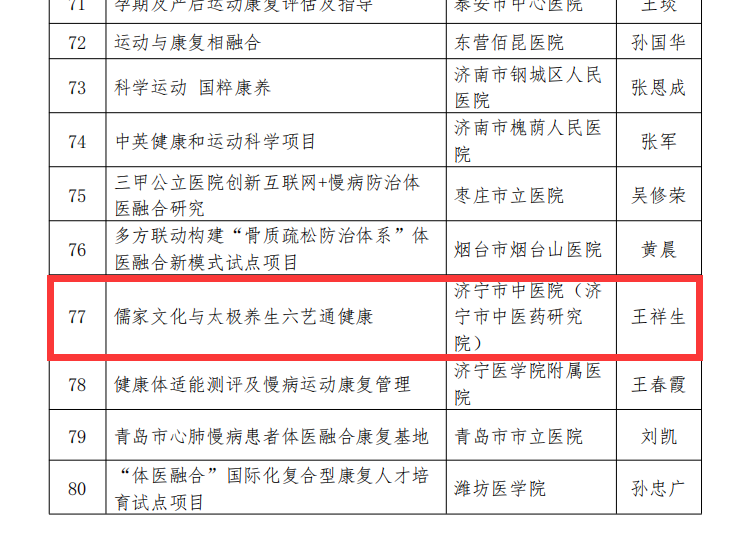 近日,山东省体医融合试点工作办公室下发工作简报,公布山东省第一批体医融合试点培育项目单位,济宁市中医院榜上有名。标志济宁市中医院在全市率先开展全民健身与全民健康融合发展工作见成效,对于打造济宁市体医融合新模式、助力建设健康济宁有大力促进作用。